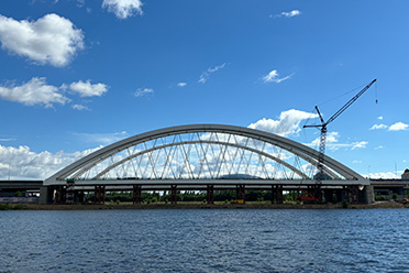 哈薩克斯坦阿斯塔納市輕軌一期伊希姆河鋼拱橋項目該拱橋位于哈薩克斯坦總統(tǒng)府旁,橋長155m,為下承式簡支系桿拱,主拱矢高2m,拱肋和主梁均采用鋼結(jié)構(gòu),拱肋采用鋼箱拱,主梁為鋼結(jié)構(gòu)縱橫梁體系。 -